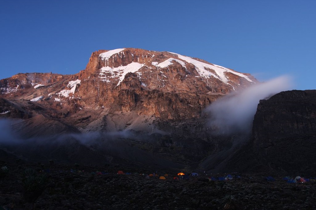 After breakfast continue with the trekking passing through Hans Meyers Notch upto Kibo hut for meals and overnight..